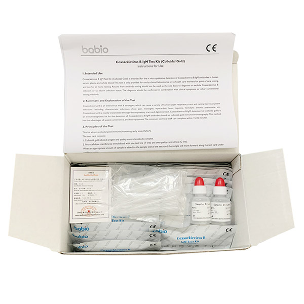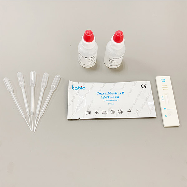 Coxsackievirus B est enterovirus cum 6 serotypes, quod varias tractus respiratorii superioris et systematis nervosi centralis causare potest. Infectiosis pectoris dolor comprehendens, meningitis, myocarditis, febris, hepatitis, anemia hemolytica, pneumonia, etc. Coxsackievirus B maxime per tractus respiratorii et tractum digestivum traducitur. Coxsackievirus B IgM detectio ornamentum (aurum colloidale) est ornamentum immunodiagnosticum ad deprehensionem Coxsackievirus B IgM elementorum in colloidalium auri immunochromatography. Haec methodus commoda celeritatis, commoditatis et minus instrumenti habet. Minimum technicum baculum intra 15- perficere potest. 20 minuta.