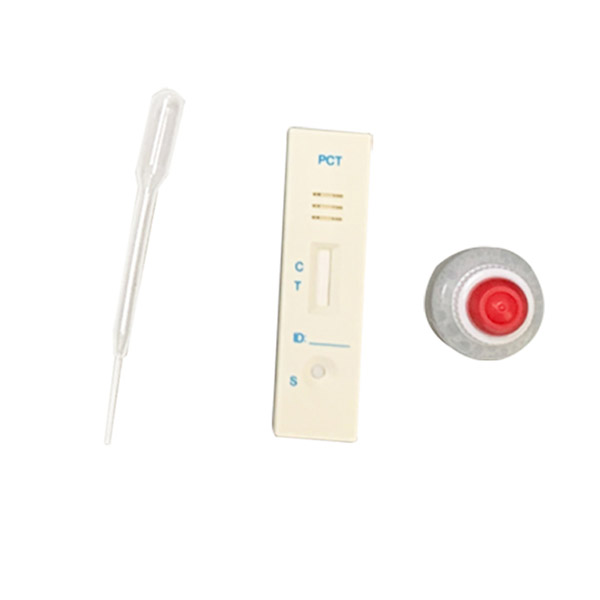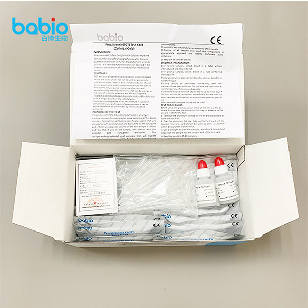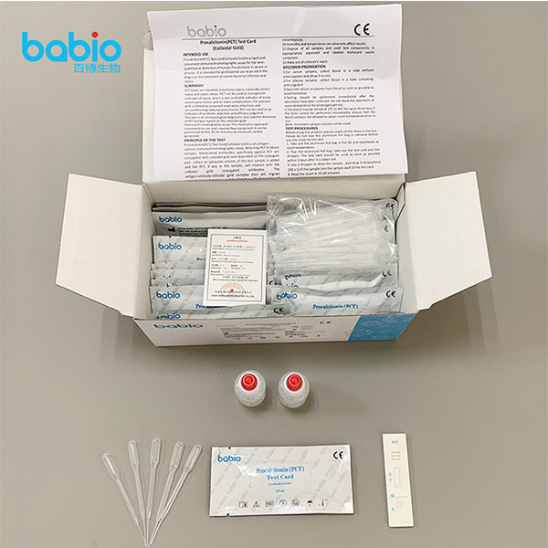 Procalcitonin (PCT) Testium card (Colloidale Aurum) est tentamentum antigen-captivum immunochromatographicum, deprehensio PCT in speciminibus sanguinis. Antibodies monoclonales specialiter contra PCT cum auro colloidali conjugantur et in pad coniugali deposita. Cum aptum volumen experimenti specimen addatur et PCT, si quis in sample, cum elementis coniugatis aurum colloidalibus penitus se habebit. Antigeno-antibody-colloidale complexum aurum tunc migrabit versus fenestram test usque ad Zonam Testam (T) ubi capientur ab elementis immobilibus, lineam rubram (lineam Testam visibilis) ostendens eventum positivum. Si PCT absens vel infra limitem deprehensionis minimum (0.2ng/ml) in sample, nulla linea rubra in Zona test (T) ostendens eventum negativum. Absentia lineae rubrae potestate in Zonae Control indicium est de invalido effectu.