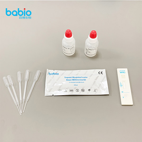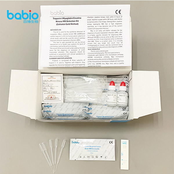Troponin I/Myoglobin/Creatinum Kinase MB Detection Ornamentum (Modus Colloidalis Gold) adhibetur pro detectione qualitativa myoglobini (Myo), kinasi creati MB (CKMB) et troponin cardiaci I (cTnI) in serum humano, plasmate vel toto sanguine, ac adhiberi potest pro diagnosi clinica auxiliaris myocardialis infarctionis acutae (AMI).